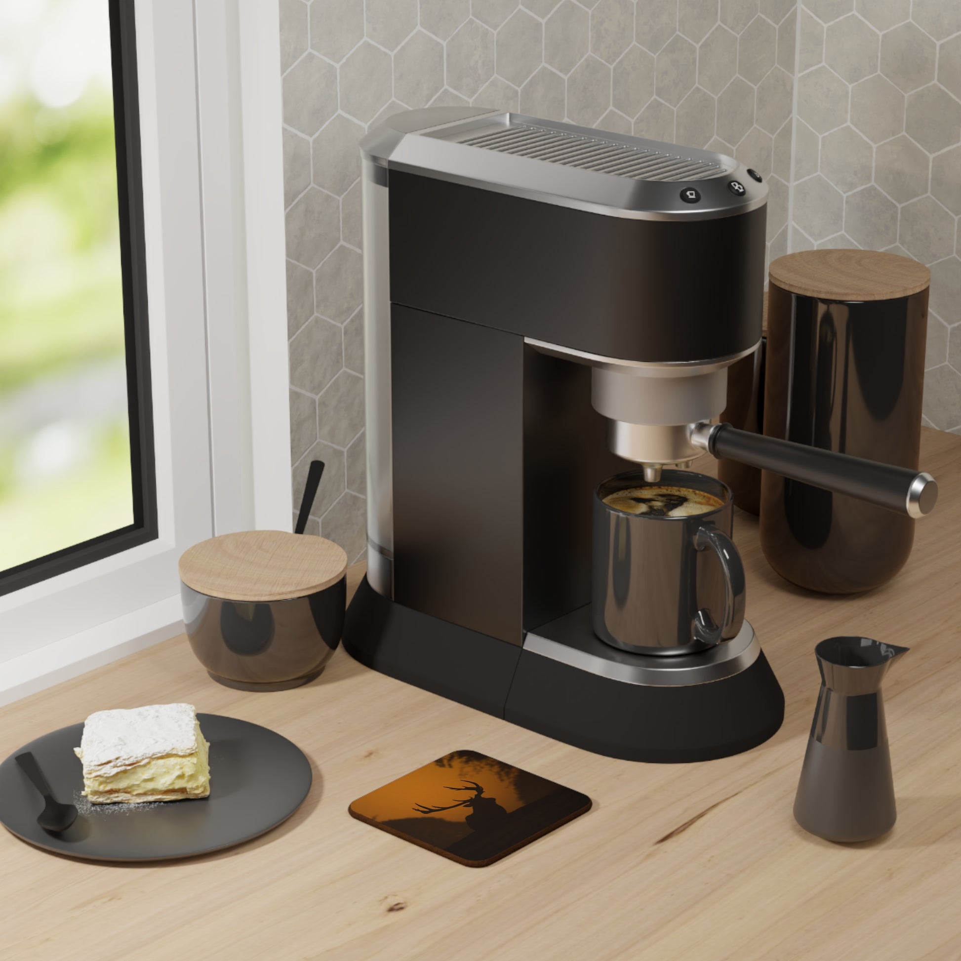 Warm, quiet, and belonging — this hardboard coaster brings a moment of dusk into everyday rituals. The glossy, full-color print captures a stag silhouette at sunset, its antlers etched against an amber sky. Set it beside a steaming mug or a tumbler of something cold, and the image anchors a small pause: the hush of the woods, the slow exhale after a long day. The sturdy hardboard base keeps surfaces safe while the vibrant inks hold their depth through regular use. Thoughtful and unpretentious, this coaster slips into cabin counters, living room side tables, or a bedside tray where evenings are meant to linger.