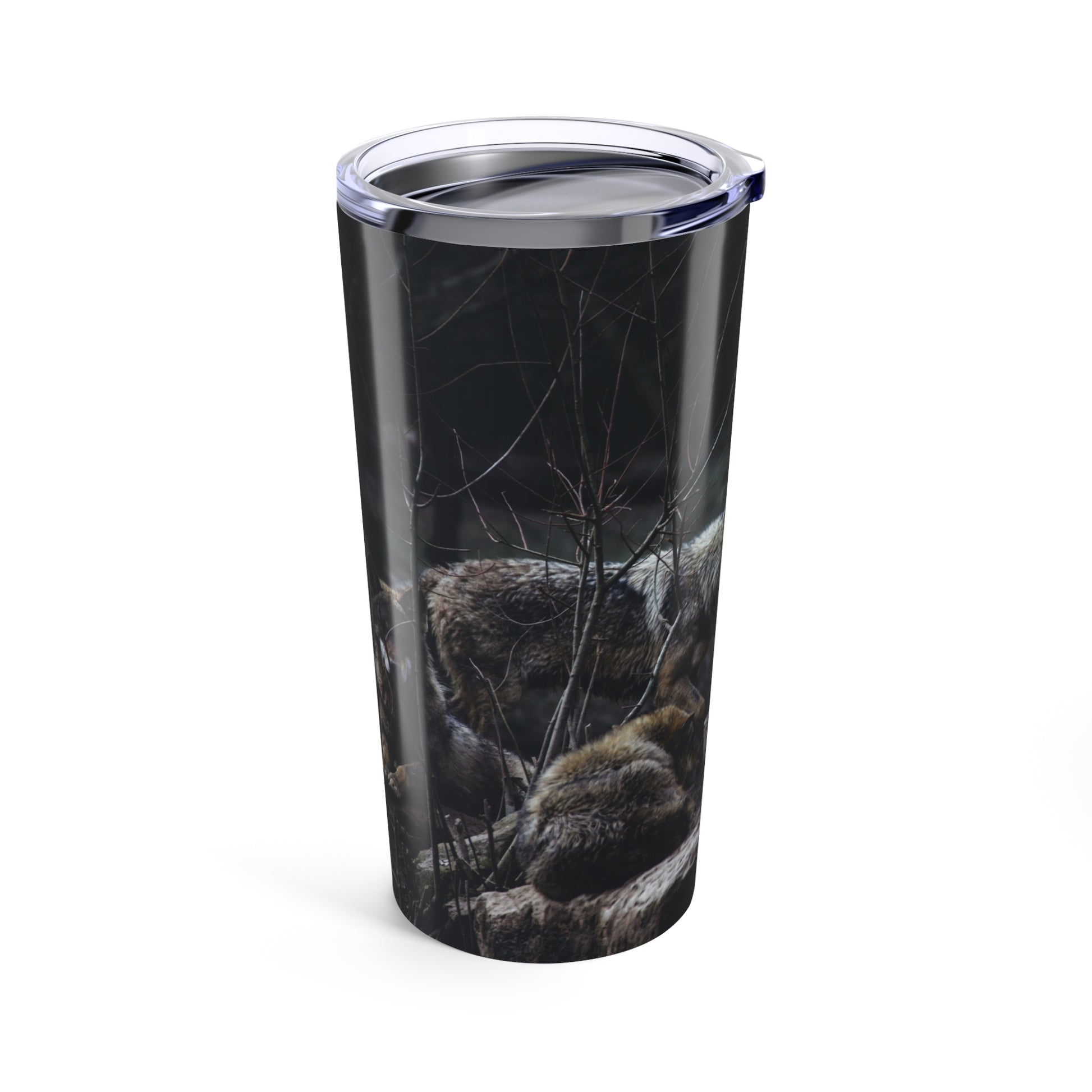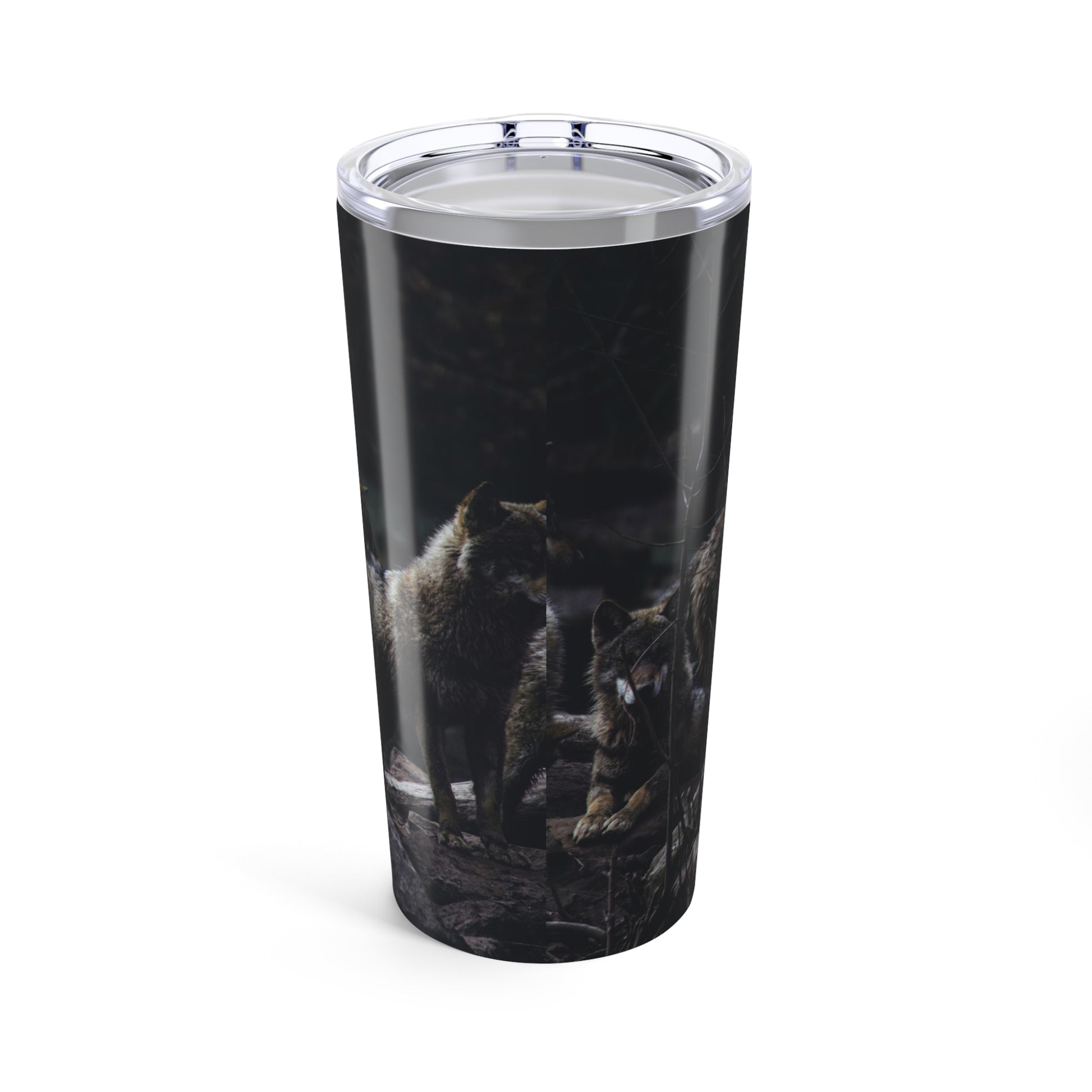 A 20oz stainless steel tumbler wrapped in a moody, wilderness photograph of wolves. It holds steady through long drives, early mornings, and late-night campfire conversations — keeping coffee hot or iced beverages cold while showing off a rich, glossy image that wraps fully around the cup. The clear push-on lid with rubber gasket seals close for fewer spills, and the rounded edges and durable vacuum-insulated body make it a practical piece for daily carry. This tumbler feels like a quiet moment on a forest trail: rugged, thoughtful, and tuned to the rhythms of outdoor life.